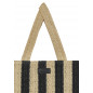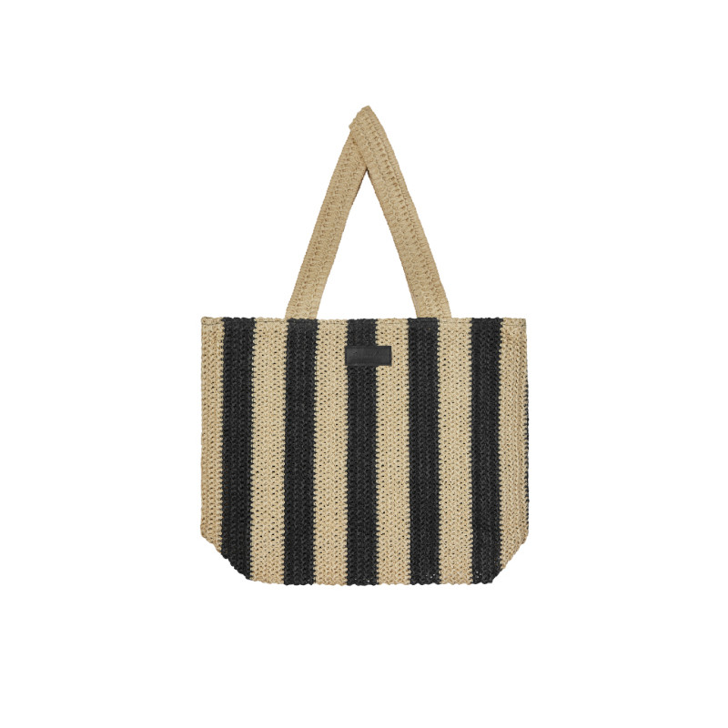 Bolso tote con diseño de rayas horizontales en tonos beige y negro. Fabricado con materiales de fibra natural, tiene asas resistentes para llevar al hombro o en la mano. Su estilo clásico y elegante lo convierte en el complemento perfecto para looks de verano o días de playa.