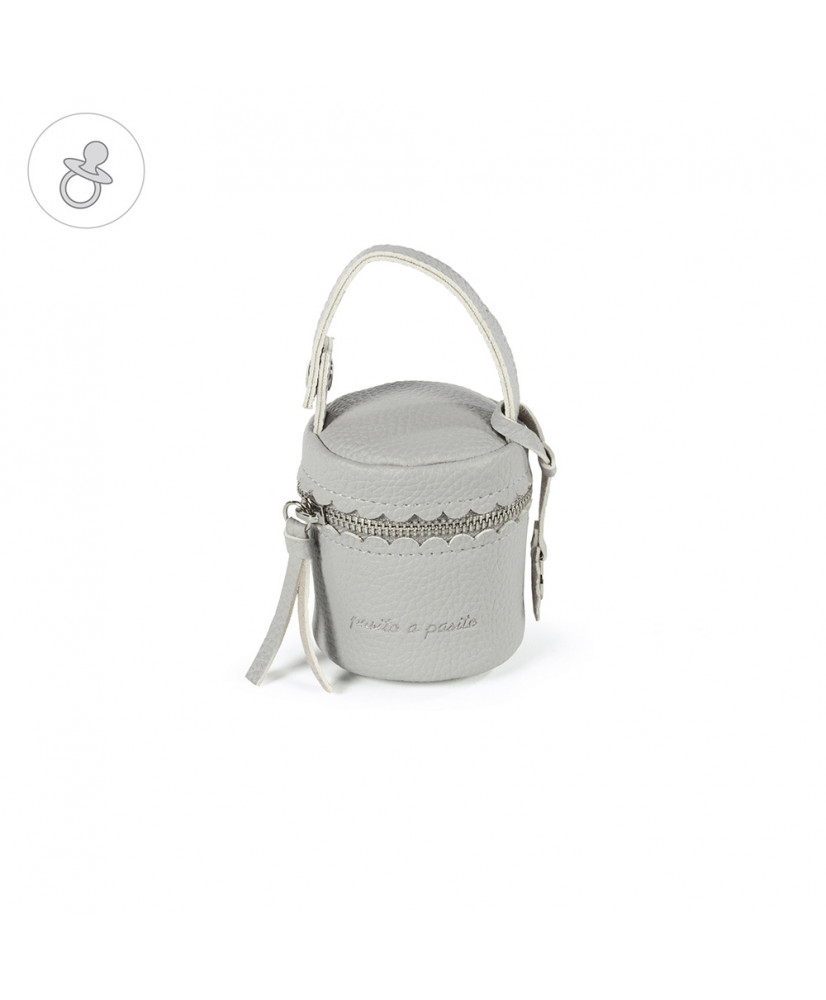 Funda Chupete Biscuit en polipiel gris. Funda para guardar el chupete de tu bebé. Gracias a su asa con broche podrás llevarla colgada de la bolsa de maternidad, del cochecito o la sillita. Se puede lavar a mano o a máquina a 30º. Los materiales utilizados están libres de colorantes azoicos, ftalatos y sustancias nocivas para la salud. Medidas: 8X9X8cm. Bolsas de maternidad Pasito a pasito.