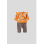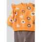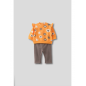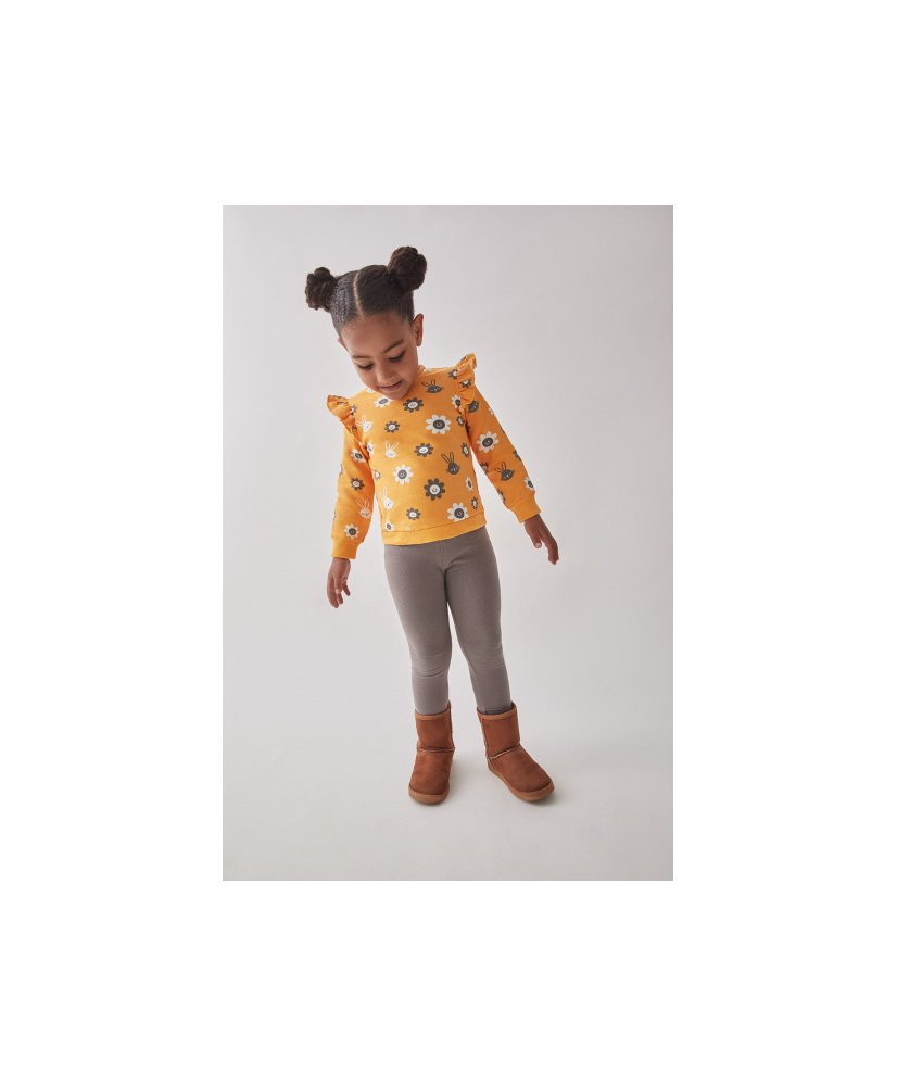 Conjunto de dos piezas para recién nacida niña de 1 a 24 meses. La sudadera en color mostaza está adornada con encantadores estampados de flores sonrientes y pequeños conejitos, y cuenta con volantes en los hombros que añaden un toque de estilo y diversión. La prenda está confeccionada con un tejido suave y cálido, ideal para los días fríos. El pantalón a juego en color gris es liso y tiene una cintura elástica para un ajuste cómodo y seguro, proporcionando calidez y confort durante el invierno. Este conjunto es perfecto para cualquier ocasión, manteniendo a la bebé abrigada y con estilo.