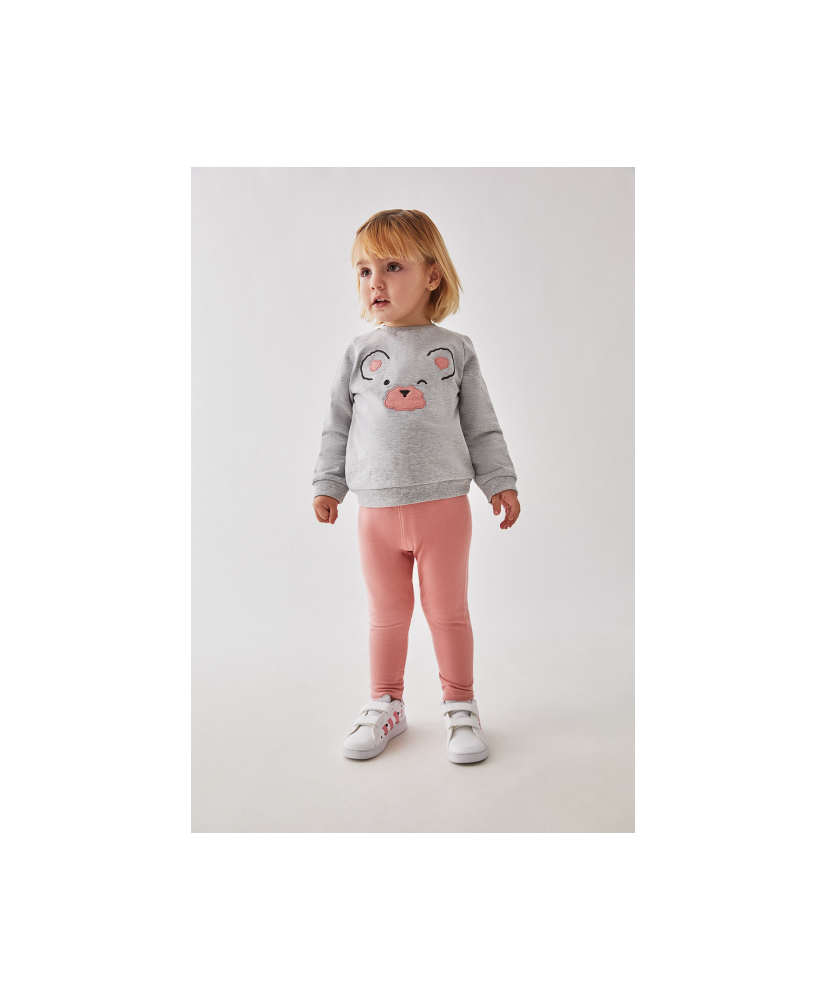 Conjunto de dos piezas para recién nacido niña de 1 a 24 meses. Sudadera en color gris vigoré con delicado detalle de afelpado en el centro y estampado. Abertura frontal con botones a presión, cuello redondo, ajuste en puños y en el bajo de la sudadera. Pantalón en color maquillaje con goma elástica en la cintura para un mejor ajuste. Tejido suave y elástico para mayor comodidad en los días de invierno.