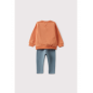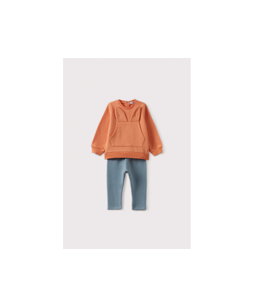 Conjunto de dos piezas para bebé niña de 3 meses a 12 meses. Sudadera en color coral con cuello redondo, bolsillo delantero con aplique de orejas de conejo. Cierre con botones a presión en la espalda para las tallas de 3 a 24 meses. Pantalón estilo leggings con elástico en la cintura para un mejor ajsute. Tejido suave y cómodo para el invierno.