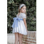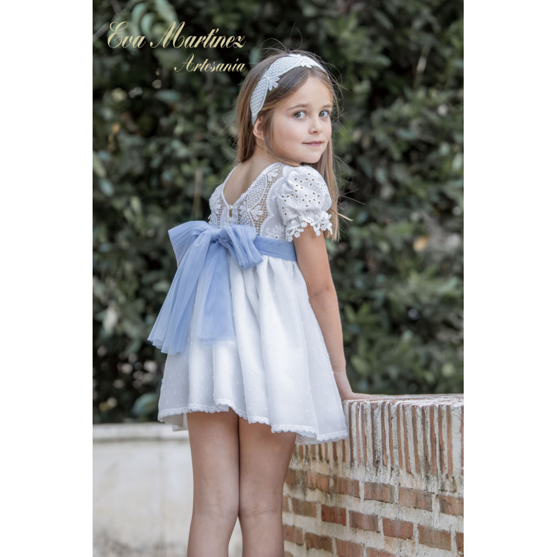 Precioso vestido de manga corta, confeccionado en plumeti de gasa para la falda y tejido bordado y calados para en el pecho y mangas, lleva fajín de tul a contraste de colo que termina en una gran lazada por la espalda que hace lucir en todo su esplendor el escote, perfecto tanto como para ceremonia y arras como para bautizo, de talle alto .