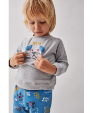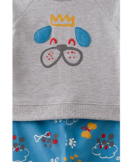 Conjunto de dos piezas para recién nacido niño de 1 a 24 meses. La sudadera gris presenta un adorable aplique de perrito en el centro, añadiendo un toque de ternura al conjunto. Confeccionada con un tejido suave y cálido, la sudadera incluye un cuello redondo y ajuste en los puños. El pantalón a juego en color azul está decorado con estampados de huellas y nubes, y cuenta con una cintura elástica para un ajuste cómodo y seguro. Este conjunto es perfecto para cualquier ocasión, manteniendo a tu bebé abrigado y con estilo.