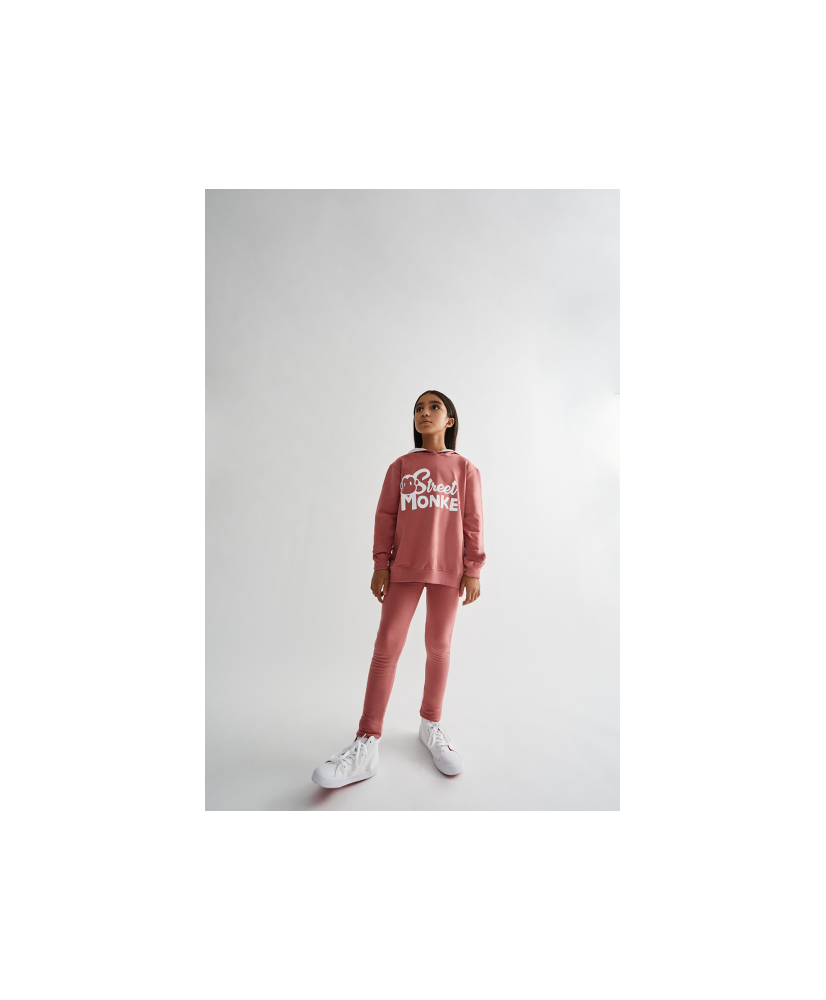 Conjunto Sudadera con capucha y leggins para niña en color maquillaje. Detalle en la parte frontal de la prenda. Tejido suave y cómodo.