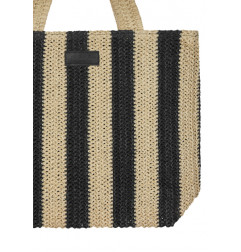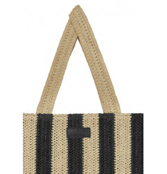 Bolso tote con diseño de rayas horizontales en tonos beige y negro. Fabricado con materiales de fibra natural, tiene asas resistentes para llevar al hombro o en la mano. Su estilo clásico y elegante lo convierte en el complemento perfecto para looks de verano o días de playa.