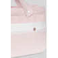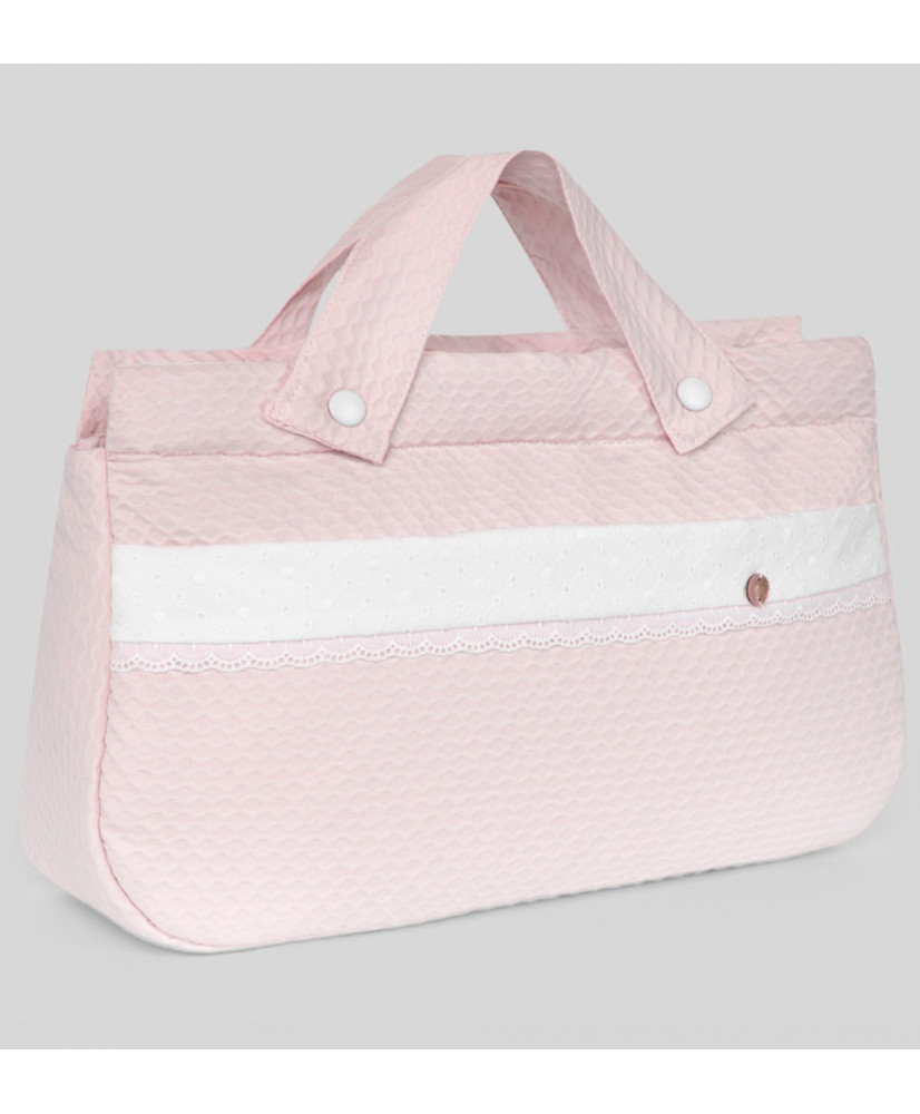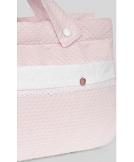 Bolso tipo panera de piqué con tejido bordado y lazada de adorno. Ideal para llevar todo lo necesario para el bebé. Puede colgarse en la silla del bebé. Incluye asa bandolera.