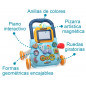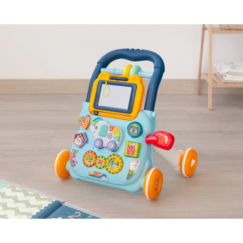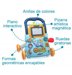 1. Un piano con forma de elefante que se puede sacar para jugar arrastrándolo ya que tiene ruedas, o pulsar sus teclas con melodías y notas musicales. 2. Una pizarra para hacer sus obras de arte y aprender a dibujar y si no le gusta su dibujo, se borra y vuelta a empezar. La puede sacar del andador y llevársela donde quiera. 3. Piezas con diferentes formas, extraibles que podrá volver a encajar y así desarrollar sus capacidades. 4. Tres ruedas forman un engranaje que hace ruido al girar, servirán para mejorar su motricidad fina.