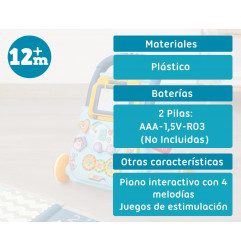 - Recomendado en niños de +18 meses. - Material: plástico. - El piano funciona con 2 pilas AAA - R06 (no incluidas). - El piano tiene 4 melodías.