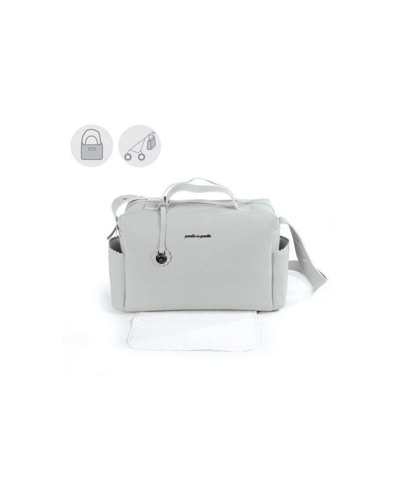 Bolsa canastilla o bolso para silla de paseo Biscuit en polipiel gris. Bolsa para silla de paseo, muy elegante y práctica. De gran capacidad para llevar todo lo que necesite tu bebé. Incluye asa larga para colgar en el cochecito y asas de mano. Forro interior blanco con bolsillos. Incluye cambiador. Se puede lavar a mano o a máquina a 30º. Los materiales utilizados están libres de colorantes azoicos, ftalatos y sustancias nocivas para la salud. Medidas: 42x25x16 cm. Bolsas de maternidad Pasito a pasito.