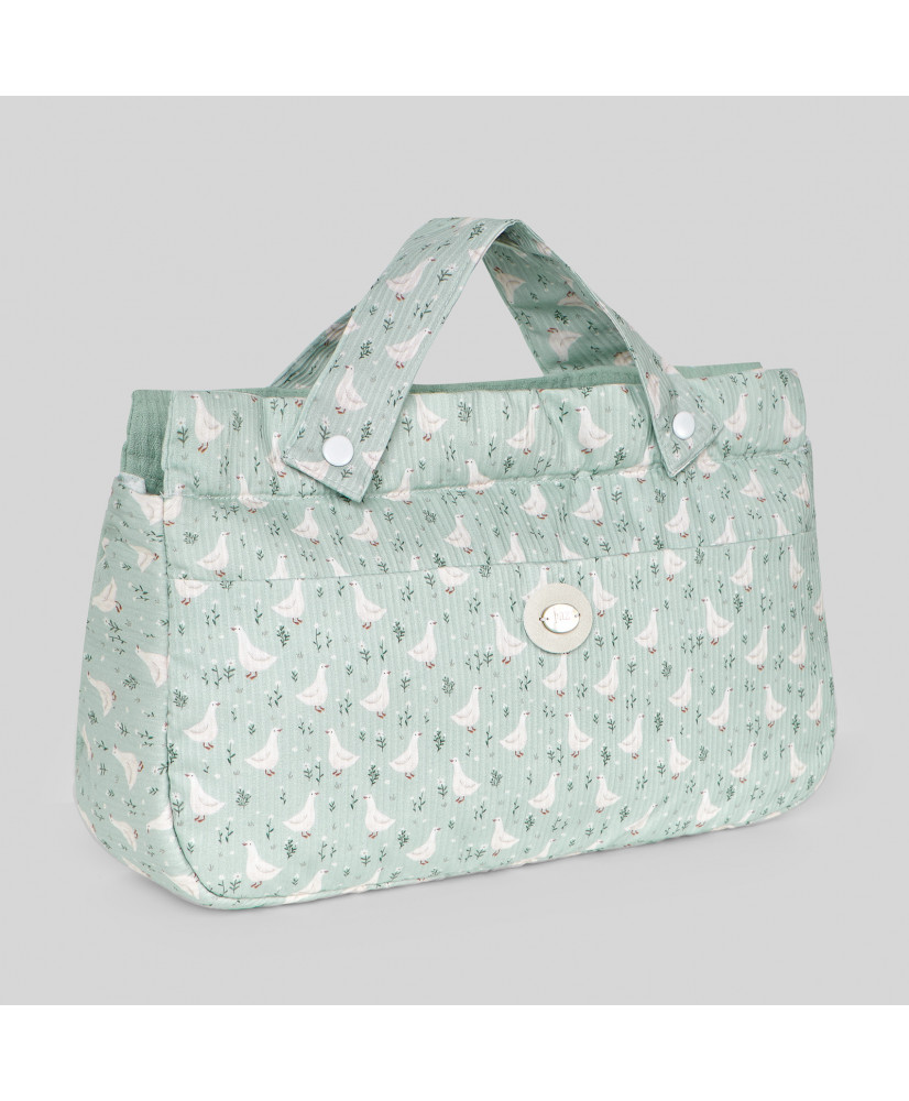 Bolso tipo panera de otomán estampado ocas. Ideal para llevar todo lo necesario para el bebé. Puede colgarse en la silla del bebé. Incluye asa bandolera.