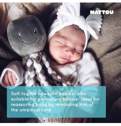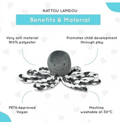 El producto estrella de Nattou, el pulpo de peluche, en sus distintos colores, es uno de los favoritos de los recién nacidos y los bebés prematuros de todo el mundo. Este simpático pulpo está especialmente diseñado para tener en cuenta el reflejo innato de agarre de los bebés. Los tentáculos les recuerdan al cordón umbilical, para una sensación de seguridad y comodidad en los primeros años de vida.
