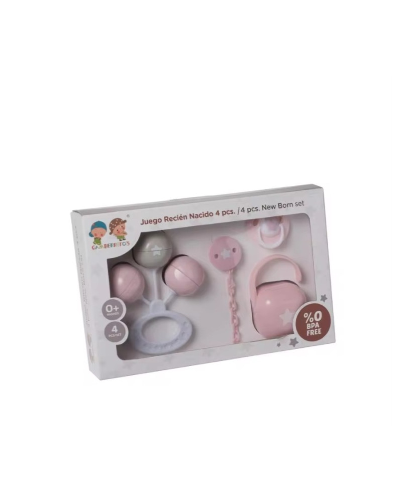 Juego infantil Gamberritos compuesto de Sonajero que cumple la normativa EN71,Pinza del chupete que cumple con la normativa EN 12586, Chupe y Guardachupete que cumplen con la normativa EN 1400.
