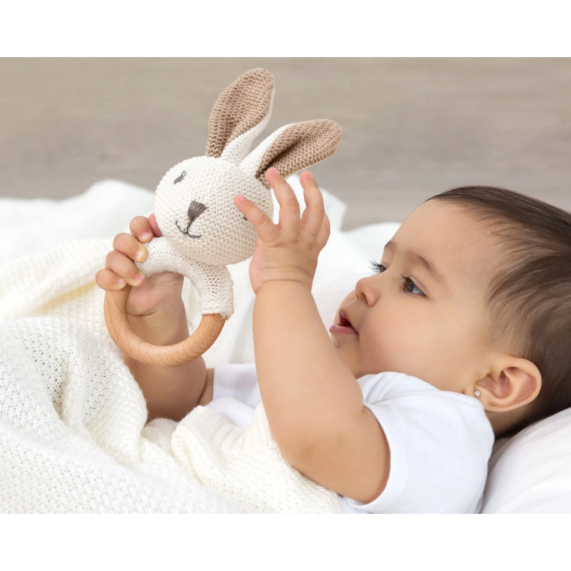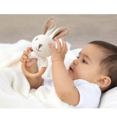Todos los juguetes y materiales de la colección están testados para menores de 3 años por lo que son completamente seguros. Si a todo esto le añadimos que los pesonajes y colores son amor, nuestra colección más ecofriendly se convierte en el juguete ideal. En este caso, se trata de un mordedor de madera de haya con forma de conejito beige con grandes orejas.