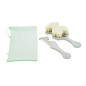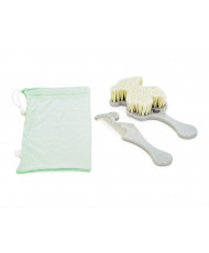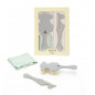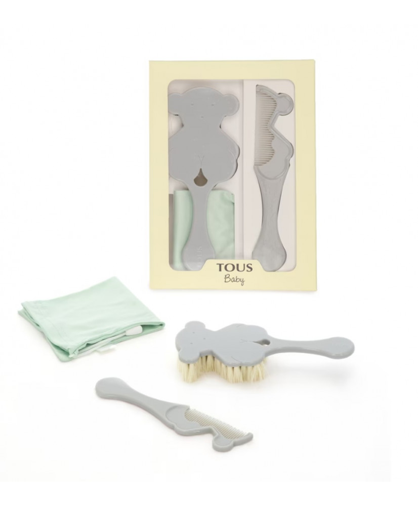 Set de cepillo y peine Baby TOUS en forma de Oso, de extremos redondeados y suave pelo de cerdas naturales. Indispensable para asear y cuidar al bebé sin dañar su delicada piel y cabello. Incluye bolsa de transporte específica para este set. COMPOSICIÓN: 100% PVC de color Gris / 100% Cerdas naturales.