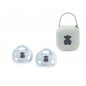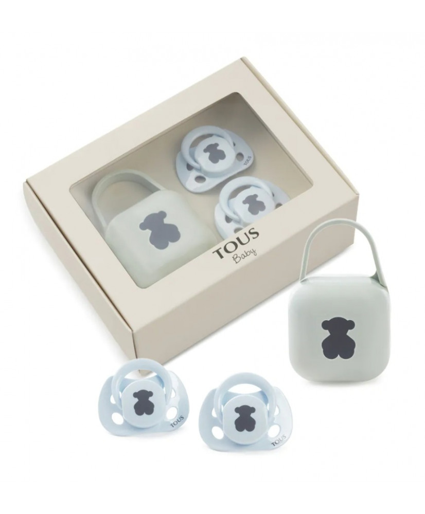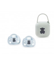 Pack 2 chupetes y portachupetes TOUS Baby anatómicos para bebés de 0-6 meses. Chupetes con tetina anatómica de silicona. Es la tetina mas recomendada ya que consigue que la lengua se mantenga en la misma posición natural que cuando el bebé mama. Permite más espacio a la lengua en la cavidad bucal, dejando que se resarrolle el maxilar y la mandibula. Portachupetes con capacidad para guardar hasta 2 chupetes con asa flexible para poder colgar en cualquier lugar (6 cm ancho x 7 cm fondo x 11 cm alto). Chupete anatómico de silicona 0-6 meses (2 unidades). Cunple con la normativa 1400 + A2: 2019. Silicona especial para uso alimentario. Color azul celeste.