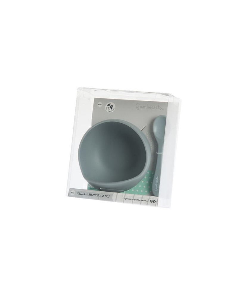 Vajilla infantil de 2 piezas hecha en silicona. Consta de cuenco y cuchara. Recomendado +4m