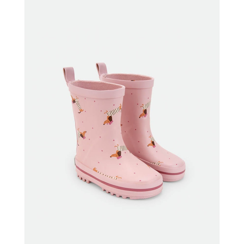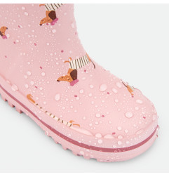 BOTA DE AGUA CON ESTAMPADO DE PERROS SALCHICHA CON FONDO ROSA Y MINI CUADRADITOS, ACABADO MATE. FORRO INTERIOR Y PLANTILLA EXTRAÍBLE.