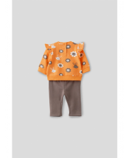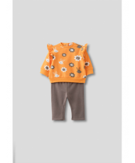 Conjunto de dos piezas para recién nacida niña de 1 a 24 meses. La sudadera en color mostaza está adornada con encantadores estampados de flores sonrientes y pequeños conejitos, y cuenta con volantes en los hombros que añaden un toque de estilo y diversión. La prenda está confeccionada con un tejido suave y cálido, ideal para los días fríos. El pantalón a juego en color gris es liso y tiene una cintura elástica para un ajuste cómodo y seguro, proporcionando calidez y confort durante el invierno. Este conjunto es perfecto para cualquier ocasión, manteniendo a la bebé abrigada y con estilo.