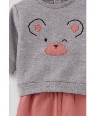 Conjunto de dos piezas para recién nacido niña de 1 a 24 meses. Sudadera en color gris vigoré con delicado detalle de afelpado en el centro y estampado. Abertura frontal con botones a presión, cuello redondo, ajuste en puños y en el bajo de la sudadera. Pantalón en color maquillaje con goma elástica en la cintura para un mejor ajuste. Tejido suave y elástico para mayor comodidad en los días de invierno.