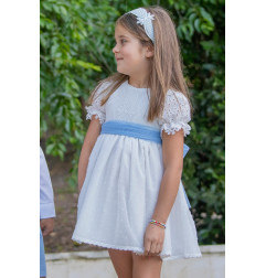 Precioso vestido de manga corta, confeccionado en plumeti de gasa para la falda y tejido bordado y calados para en el pecho y mangas, lleva fajín de tul a contraste de colo que termina en una gran lazada por la espalda que hace lucir en todo su esplendor el escote, perfecto tanto como para ceremonia y arras como para bautizo, de talle alto .