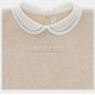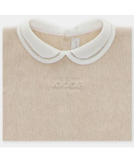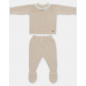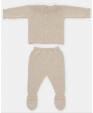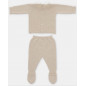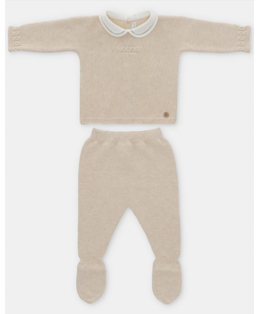 Conjunto de bebé niño formado por jubón con cuello bebé y estructura de punto links con detalles punto trenzado y polaina, en arena. Realizado en 100% algodón. Fabricado en España.