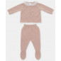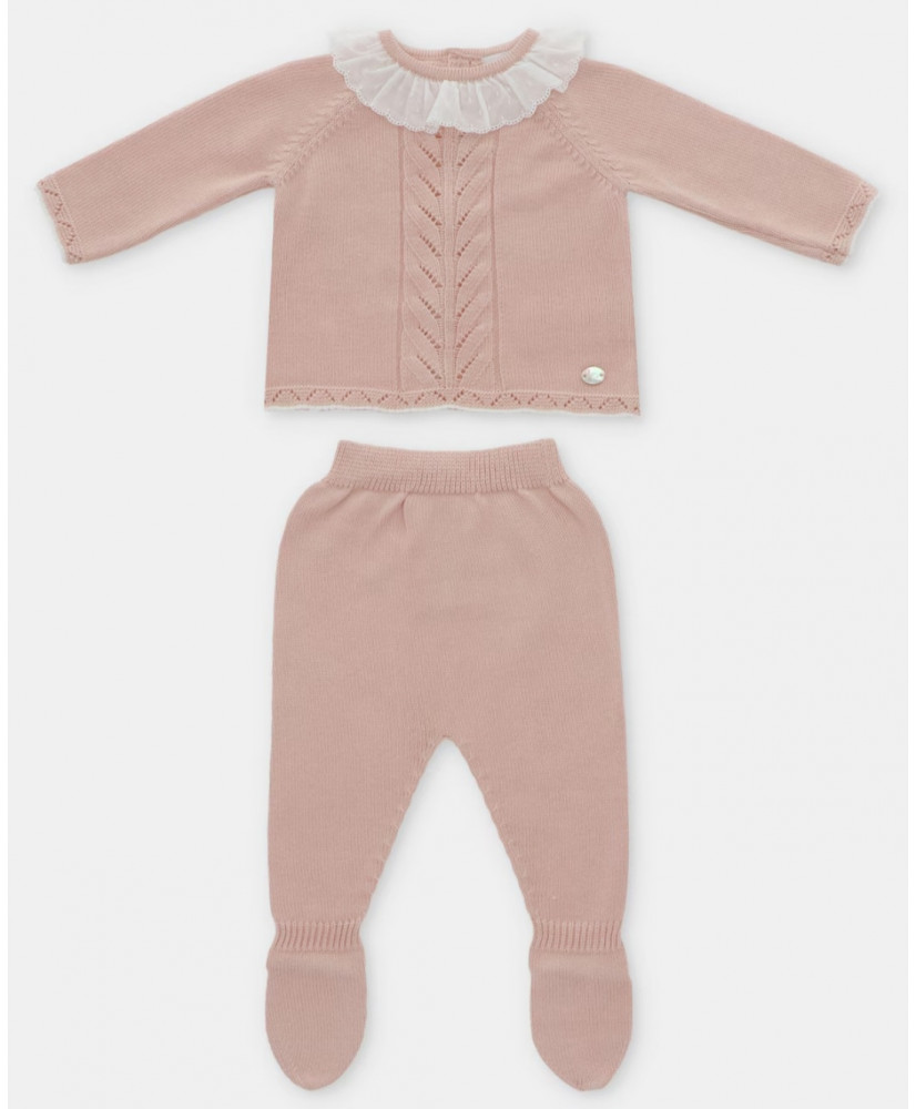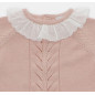 Conjunto de bebé niña formado por jubón con cuello volante y estructura de punto links con calados y polaina, en rosa empolvado. Realizado en 100% algodón. Fabricado en España.